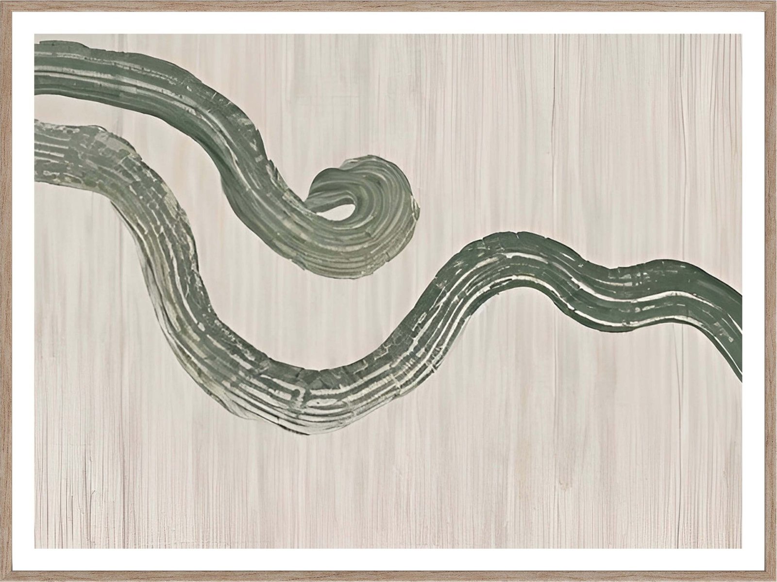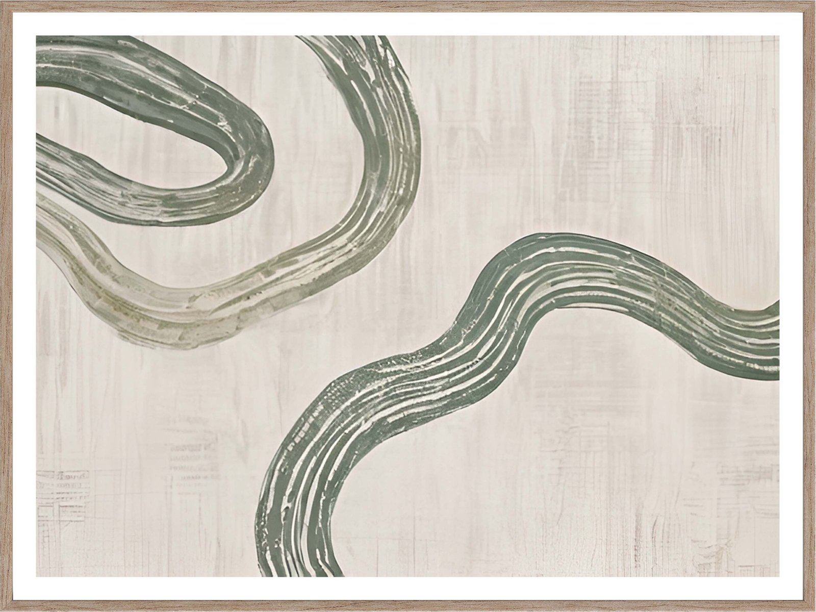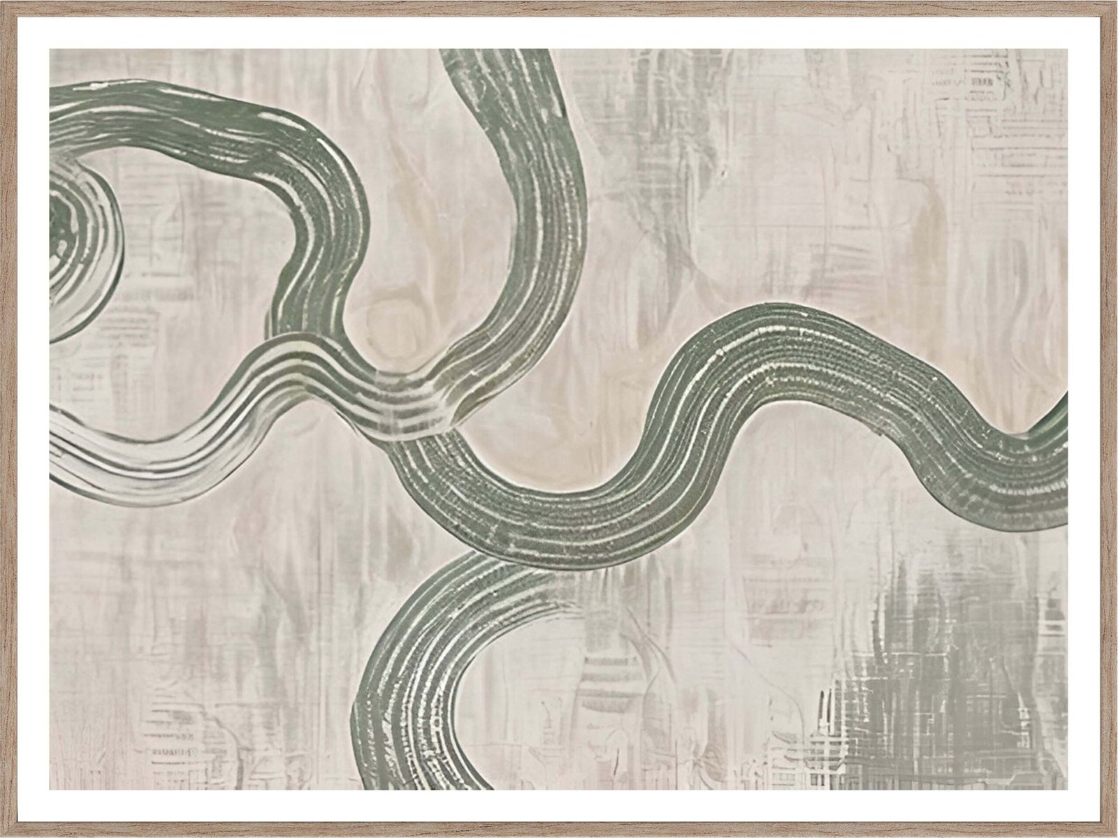 This abstract artwork features a graceful, flowing design of soft green lines meandering across a muted beige background. The organic curves and delicate textures create a calming and serene atmosphere, making it a perfect addition to any room seeking a touch of tranquility. The minimalist design and gentle color palette make it a versatile piece that complements various interior styles, from modern to rustic.