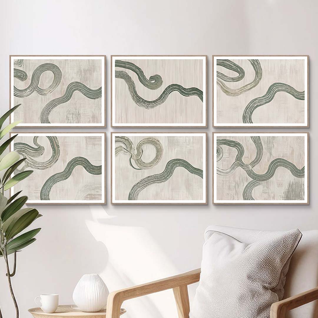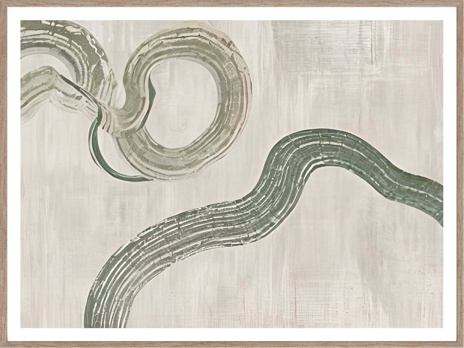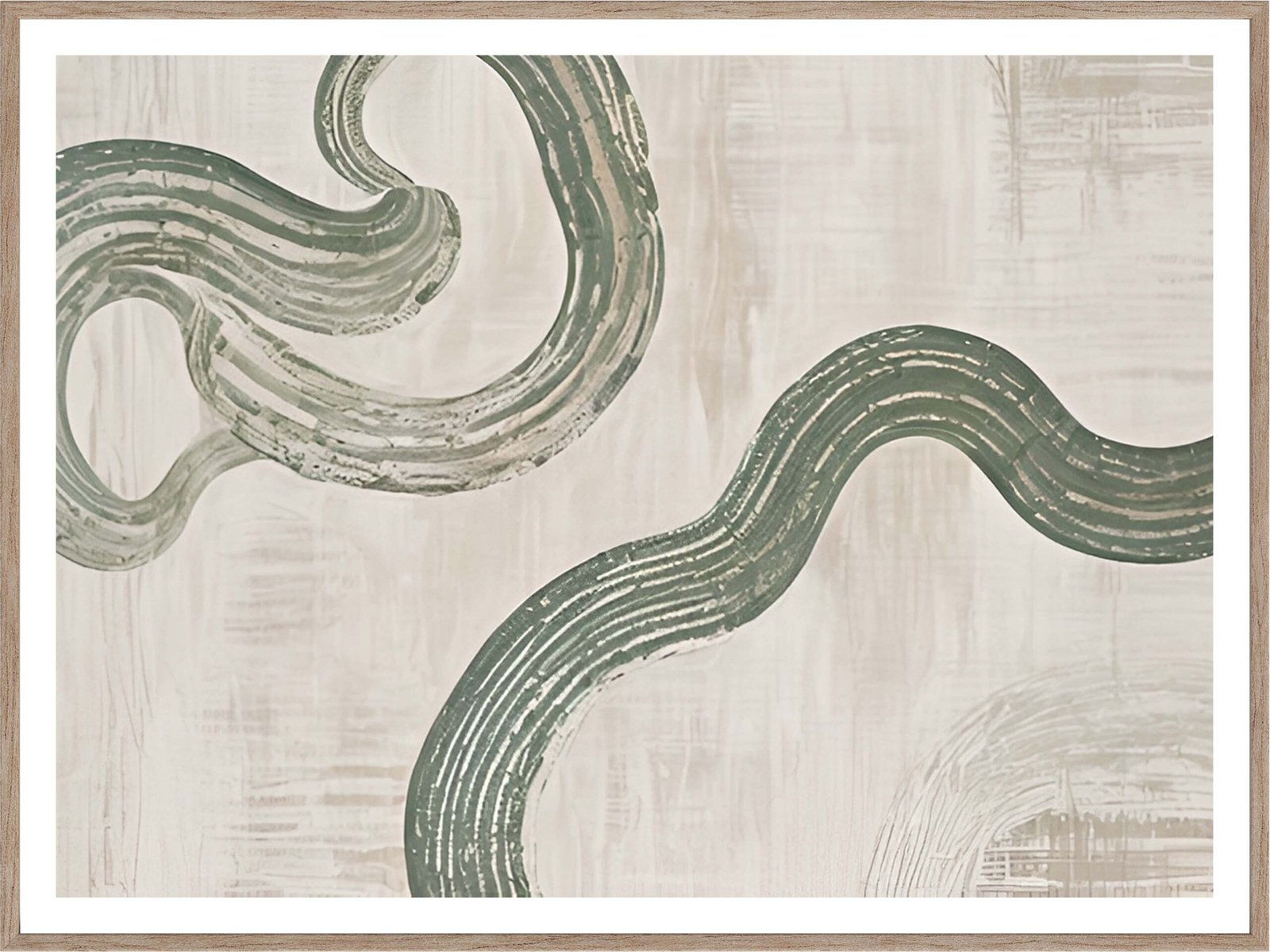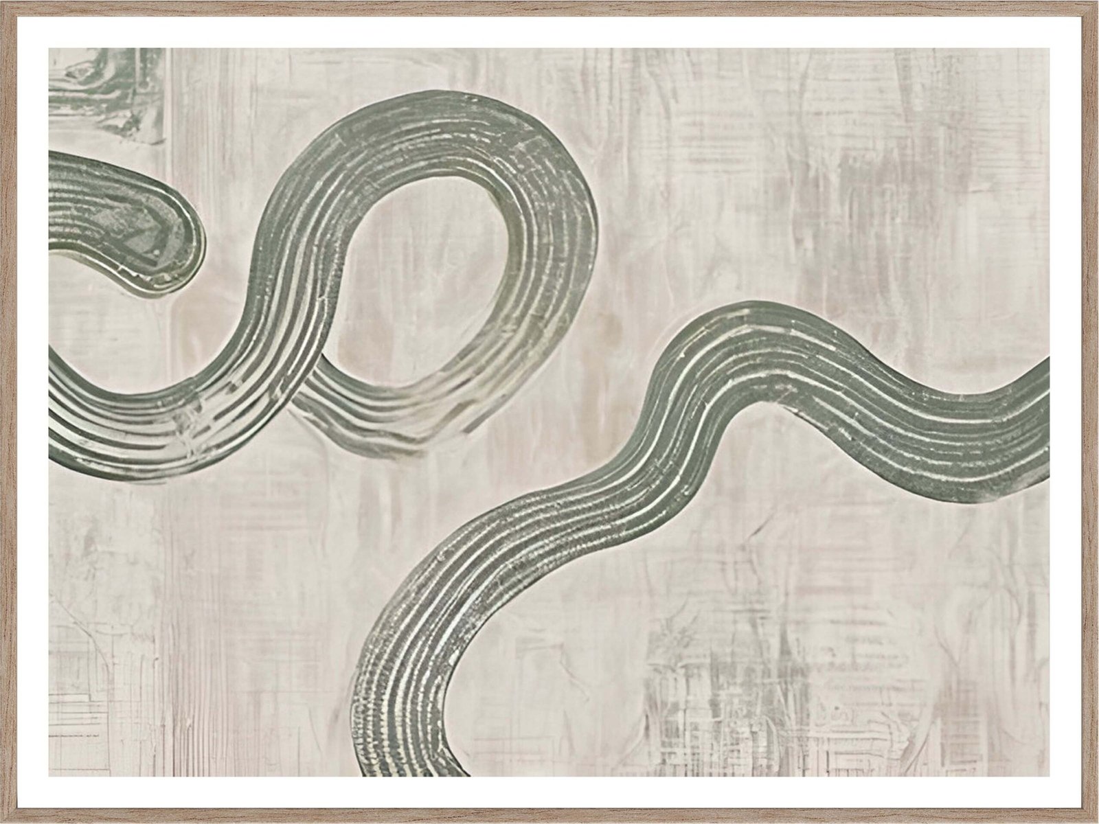 This abstract artwork features a graceful, flowing design of soft green lines meandering across a muted beige background. The organic curves and delicate textures create a calming and serene atmosphere, making it a perfect addition to any room seeking a touch of tranquility. The minimalist design and gentle color palette make it a versatile piece that complements various interior styles, from modern to rustic.